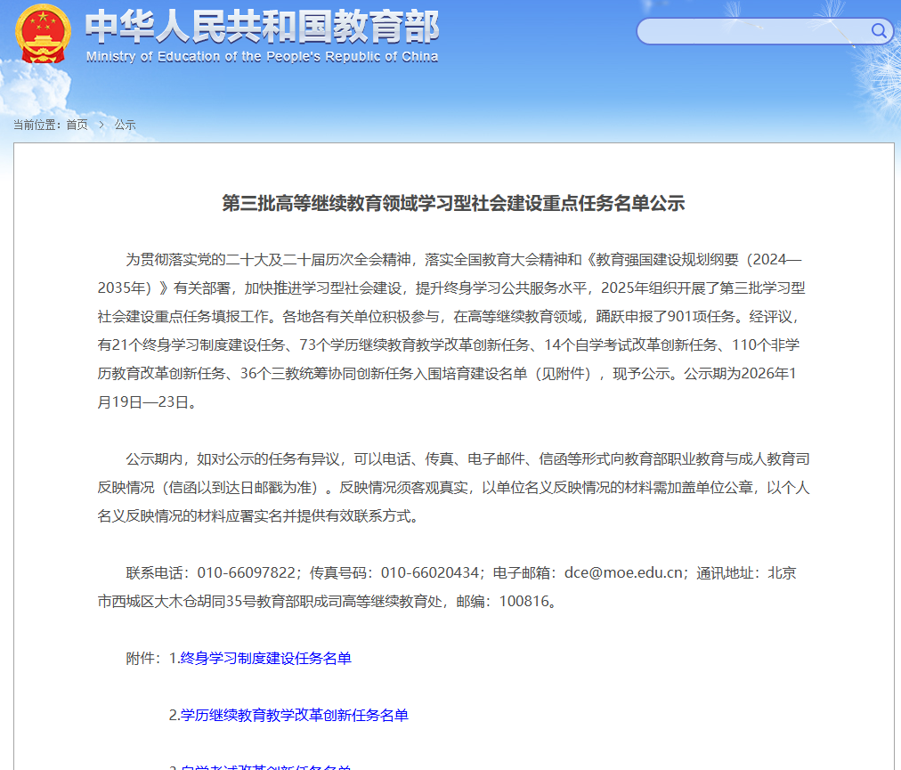 开展学习型社会建设重点任务,是深入贯彻落实党的二十大及二十届历次全会精神与《教育强国建设规划纲要(2024—2035年)》有关部署的重要实践,是推动学习型社会建设、实施国家教育数字化战略工程的核心组成部分,也是构建全民终身学习体系、支撑教育强国建设的关键举措。据教育部公布,本次高等继续教育领域重点任务申报总数达901项。经评议,最终共有254项任务入选培育建设名单,其中包括终身学习制度建设任务21项、学历继续教育教学改革创新任务73项、自学考试改革创新任务14项、非学历教育改革创新任务110项,以及三教统筹协同创新任务36项。