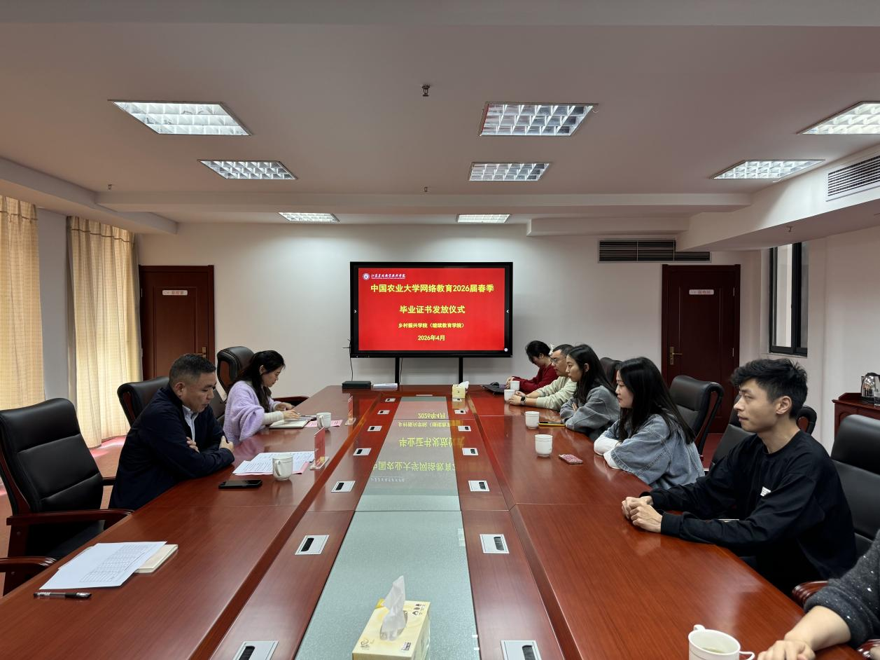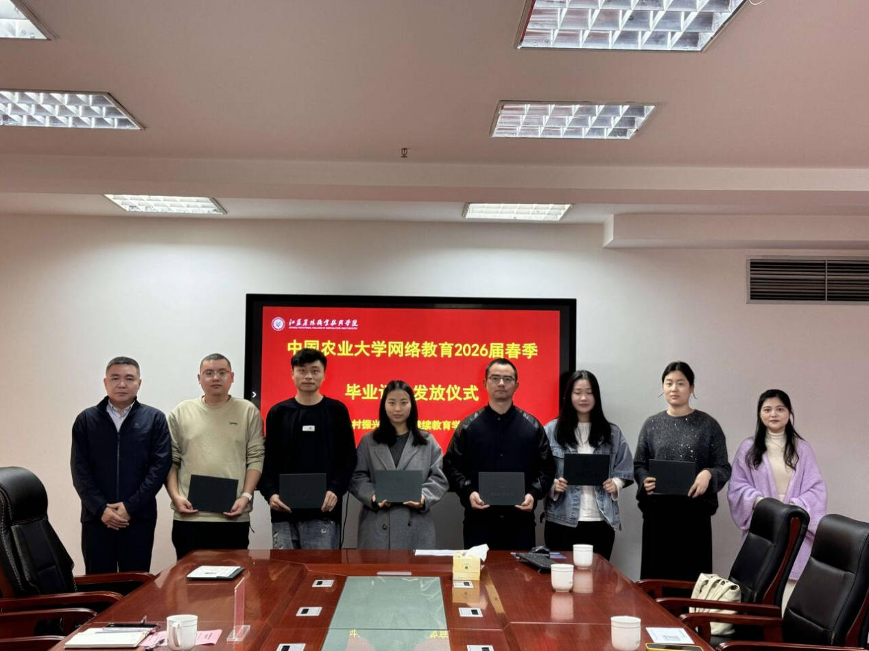 4月2日下午,中国农业大学网络教育 2026 届春季毕业证书发放仪式在江苏农林职业技术学院乡村振兴学院隆重举行。乡村振兴学院(继续教育学院)副院长万孝军、学历教育科相关工作人员及中国农业大学网络教育 2026 届春季毕业生参加仪式。
